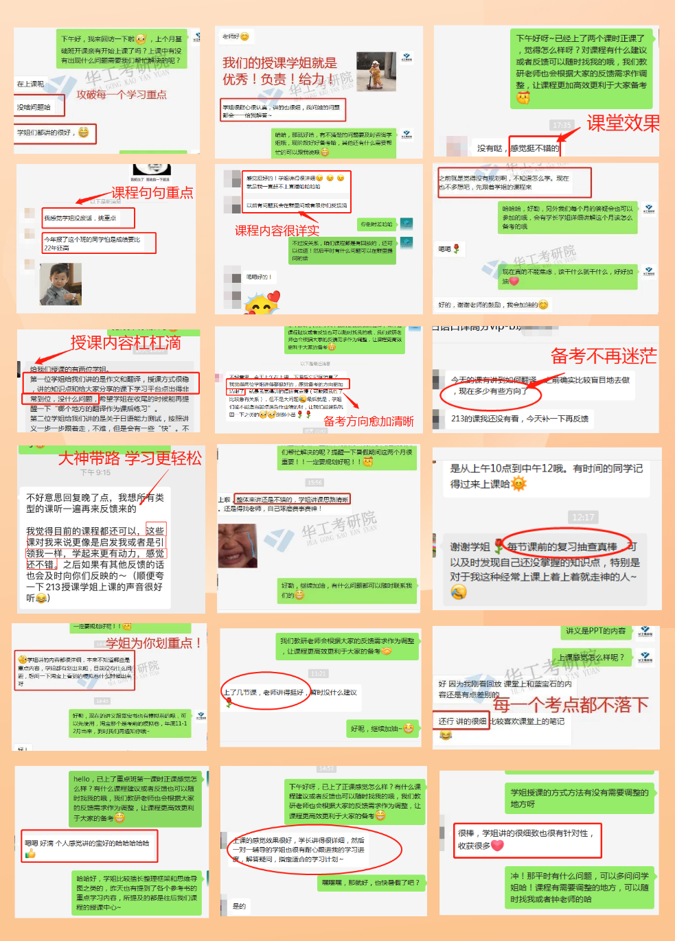 教辅团队主要成员为华工历年高分上岸学长学姐。各位学长学姐授课之余,会第一时间和大家分享院校动向及导师近期关注的话题,让你时刻握准考题命脉,做到备考不跑偏、不白背、不白学。