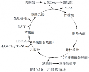 5、乙醛酸循环 植物和微生物中还可通过所谓“乙醛酸循环”使乙酰CoA转变成琥珀酸。乙醛酸循环可以说是三羧酸循环的辅佐途径,其过程如图所示。