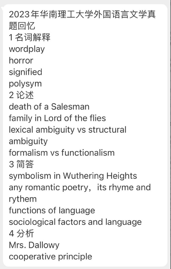 2.真题:近三年题型较为稳定,之前语言学和文学是分开考的,考文学的方向,语言学有30分必答题。20-22年为大综合合卷,初试不区分方向,文学语言学各占75,题型和分值完全相同,题量对半。题型有:名词解释4x5',问答题4x10', 评述题4x10',大题2x25'