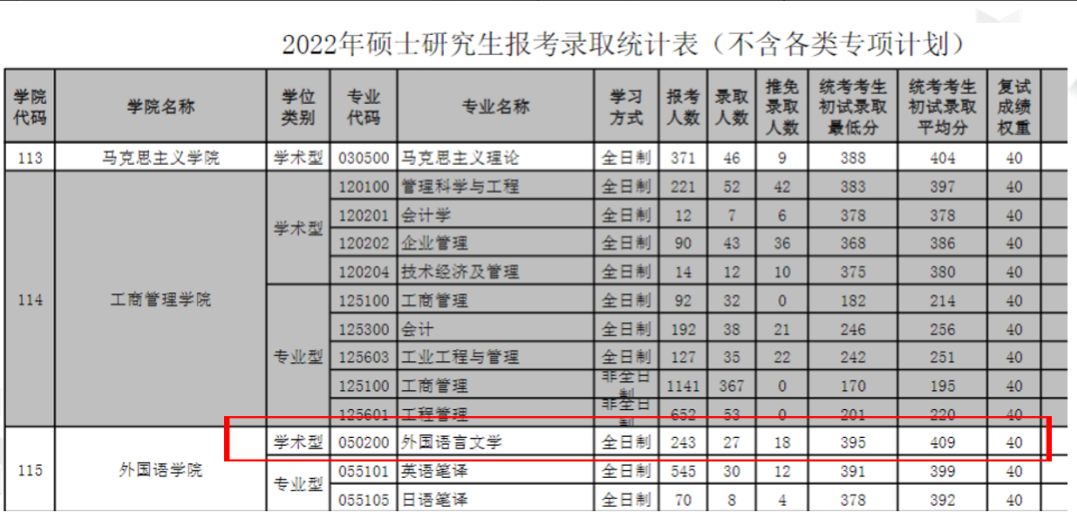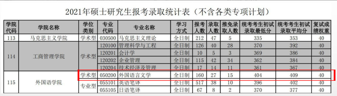 外国语言文学统考报名人数243人,统考录取人数为9人,推免直升15人,报录比约为12.78。