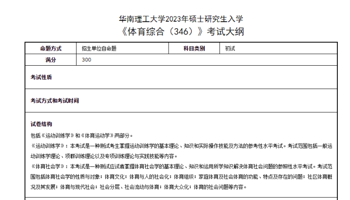 专业课: 华南理工大学体育考研总体来说,难度为中等偏上。 首先,从参考书上来看,学硕专硕都是两本书《运动训练学》、《体育社会学》。对学生来说备考时专业课的复习量上,不算太多。 从真题来看,华南理工大学的题量还是比较多的,所以要求学生需要扎实的掌握知识点,以便作答时能较快的理清思路,并且合理的安排好每道题的作答时间。华工对初试书目的考核注重基础,并不会太活。所以一开始我就将真题都整理了出来,在目录上勾画近几年重复考的题,章节的重点也就清晰明了了。《体育社会学》这本书偏文科,优点就是好理解,但是内容偏多,要注重各个大章节之间的脉络联系。 《运动训练学》则相对偏理科一些,里面讲的都是针对各个素质的练习方法。在一开始理解的时候就会摸不着头脑(尤其是对跨考的同学),这时候就要把各个不同的方法整理放到一起进行对比。 对于两本书,我建议大家的规划大致如下: