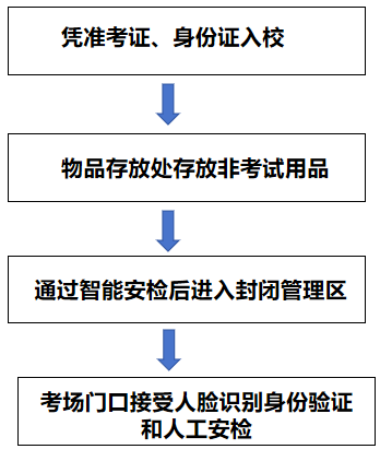 特别说明 根据考务规定,考试当天考生只准携带黑色字迹签字笔等必须的文具,凭准考证、有效身份证件入场,手机、包等其他与考试无关物品均不允许带入考场围蔽区域。本次考试在考试大楼围蔽区入口处设置智能安检门进行违禁物品检查,在考场入口进行人工安检和人脸识别检查。每场考试都要进行入场物品检查及人脸识别等,请预留充足时间。为顺利通过安检和核验,请考生在每场考试入场时遵循以下要求: