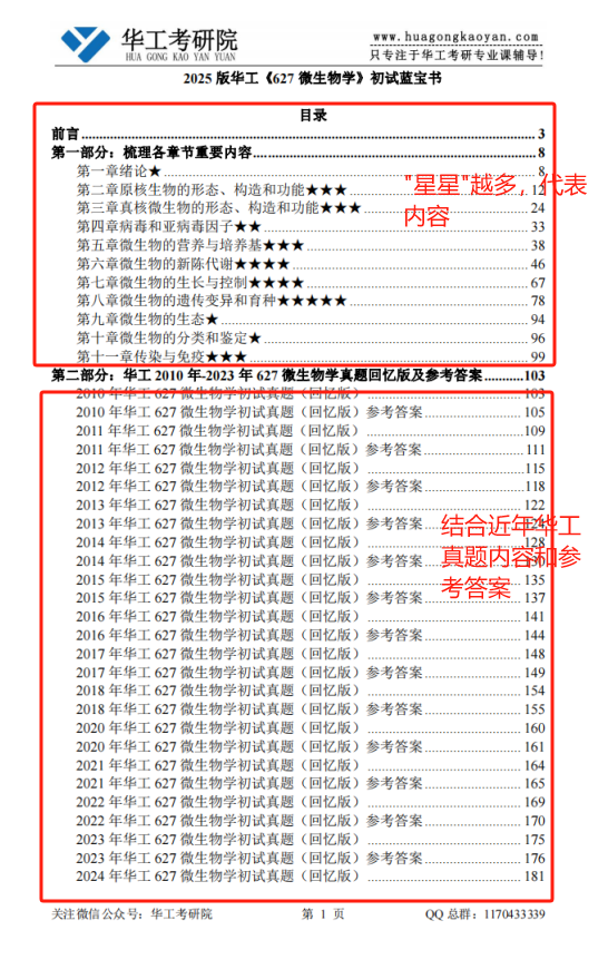 蓝宝书的构成: 第一部分是627微生物的知识点总结。本书吸收了周德庆《微生物学教程》(第四版)、《工业微生物学教程》(第二版)、本人备考的经验和一些华工的资料,删除了非考点,凝练了精华。根据本人复习经验将知识点进行梳理和总结。能够有助于同学们提高学习效率,减少前期浪费在摸索学习方式上的时间。